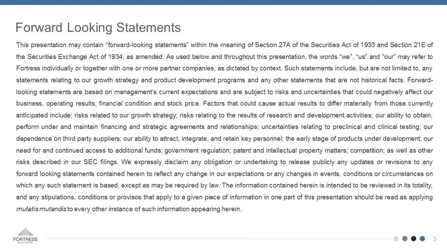 The issuer has filed a registration statement (including a prospectus) with the SEC for the offering to which this communication relates . Before you invest, you should read the prospectus in that registration statement and other documents the issuer has filed with the SEC for more complete information about the issuer and this offering . You may get these documents for free by visiting EDGAR on the SEC Web site at www . sec . gov . Alternatively, the issuer, any underwriter or any dealer participating in the offering will arrange to send you the prospectus if you request it by emailing info@fortressbiotech . com . 2