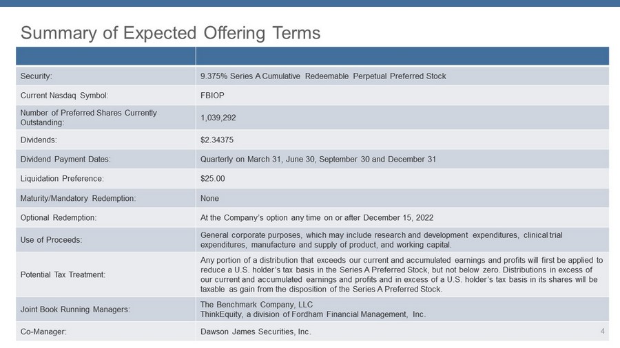 Summary of Expected Offering Terms Security: 9.375% Series A Cumulative Redeemable Perpetual Preferred Stock Current Nasdaq Symbol: FBIOP Number of Preferred Shares Currently Outstanding: 1,039,292 Dividends: $2.34375 Dividend Payment Dates: Quarterly on March 31, June 30, September 30 and December 31 Liquidation Preference: $25.00 Maturity/Mandatory Redemption: None Optional Redemption: At the Company’s option any time on or after December 15, 2022 Use of Proceeds: General corporate purposes, which may include research and development expenditures, clinical trial expenditures, manufacture and supply of product, and working capital. Potential Tax Treatment: Any portion of a distribution that exceeds our current and accumulated earnings and profits will first be applied to reduce a U.S. holder’s tax basis in the Series A Preferred Stock, but not below zero. Distributions in excess of our current and accumulated earnings and profits and in excess of a U.S. holder’s tax basis in its shares will be taxable as gain from the disposition of the Series A Preferred Stock. Joint Book Running Managers: The Benchmark Company, LLC ThinkEquity , a division of Fordham Financial Management, Inc. Co - Manager: Dawson James Securities, Inc. 4