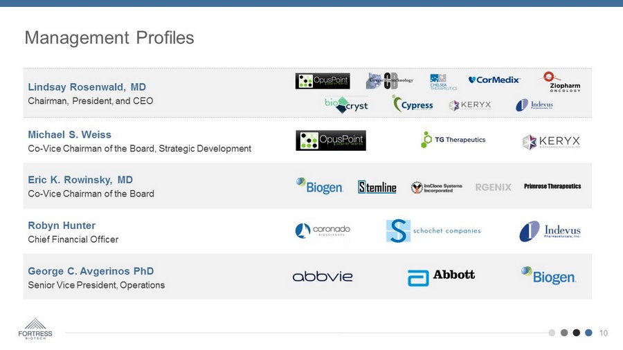 9 Development Team Programs Secret Sauce How We Do It o 10+ Business Development Professionals o 30+ Manufacturing Professionals 1 o 25+ MDs and PhDs 1 o Current portfolio includes: 5 revenue - generating dermatology products o 25+ development - stage biotech product candidates 1 o De - risked assets o High value / need o Low acquisition cost o Known buyers 1 Includes employees and product candidates in development at Fortress, at its majority - owned and majority - controlled partners. Aim to increase the intrinsic value and decrease the overall risk of Fortress