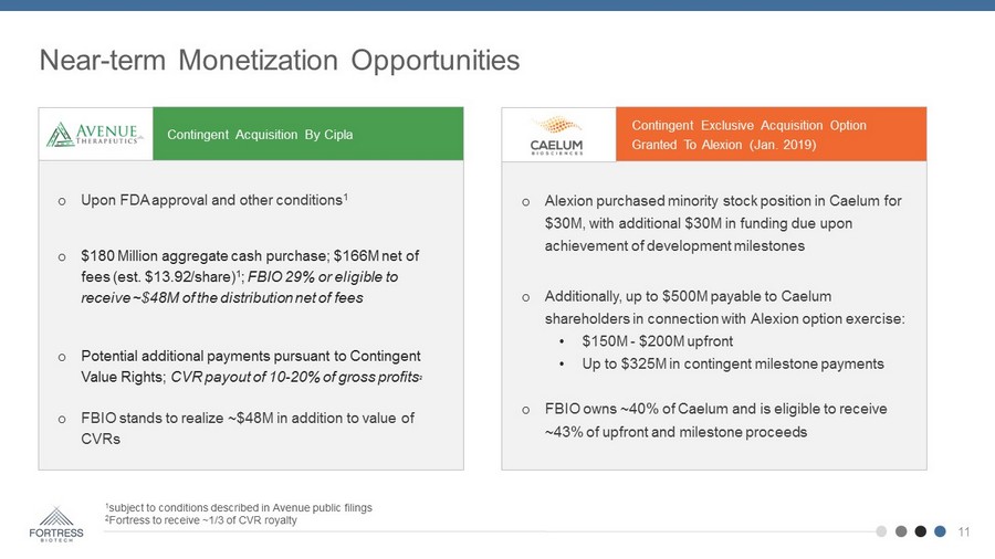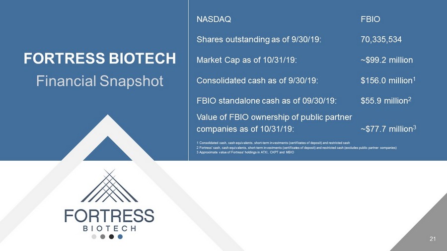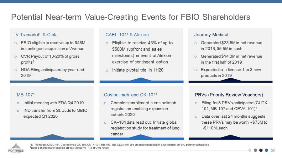 Potential Near - term Value - Creating Events for FBIO Shareholders 1 IV Tramadol, CAEL - 101, Cosibelimab, CK - 101, CUTX - 101, MB - 107, and CEVA - 101 are product candidates in development at FBIO partner companies 2 Based on internal forecasts Fortress to receive ~1/3 of CVR royalty IV Tramadol 1 & Cipla o FBIO eligible to receive up to $48M in contingent acquisition of Avenue o CVR Payout of 10 - 20% of gross profits 2 o NDA Filing anticipated by year - end 2019 MB - 107 1 o Initial meeting with FDA Q4 2019 o IND transfer from St. Jude to MBIO expected Q1 2020 Journey Medical o Generated $23.5M in net revenue in 2018, $5.5M in cash o Generated $14.3M in net revenue in the first half of 2019 o Expected to in - license 1 to 3 new products in 2019 Cosibelimab and CK - 101 1 o Complete enrollment in cosibelimab registration - enabling expansion cohorts 2020 o CK – 101 data read out, Initiate global registration study for treatment of lung cancer 20 PRVs (Priority Review Vouchers) o Filing for 3 PRVs anticipated (CUTX - 101, MB - 107 and CEVA - 101) 1 o Data over last 24 months suggests these PRVs may be worth ~$75M to ~$110M, each CAEL - 101 1 & Alexion o Eligible to receive 43% of up to $500M (upfront and sales milestones ) in event of Alexion exercise of contingent option o Initiate pivotal trial in 1H20