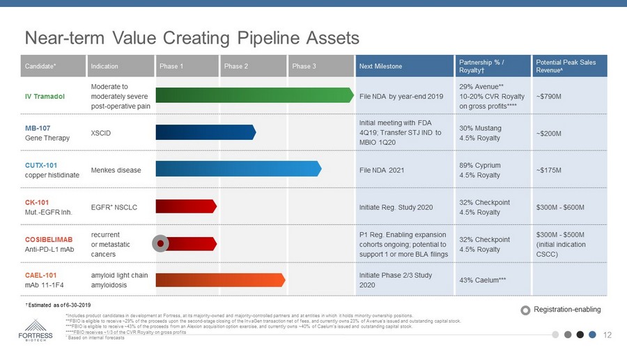 o Upon FDA approval and other conditions 1 o $180 Million aggregate cash purchase; $166M net of fees (est. $13.92/share) 1 ; FBIO 29% or eligible to receive ~$48M of the distribution net of fees o Potential additional payments pursuant to Contingent Value Rights; CVR payout of 10 - 20% of gross profits 2 o FBIO stands to realize ~$48M in addition to value of CVRs o Alexion purchased minority stock position in Caelum for $30M, with additional $30M in funding due upon achievement of development milestones o Additionally, up to $500M payable to Caelum shareholders in connection with Alexion option exercise: • $150M - $200M upfront • Up to $325M in contingent milestone payments o FBIO owns ~40% of Caelum and is eligible to receive ~43% of upfront and milestone proceeds Near - term Monetization Opportunities 1 subject to conditions described in Avenue public filings 2 Fortress to receive ~1/3 of CVR royalty Contingent Exclusive Acquisition Option Granted To Alexion (Jan. 2019) Contingent Acquisition By Cipla 11