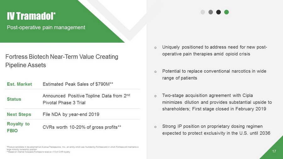 16 o Fully human IgG1 monoclonal antibody o Potential therapy for lung cancer, endometrial cancer, colorectal cancer and cutaneous squamous cell carcinoma o Potentially differentiated vs marketed PD - (L)1s o Interim P1 data showed efficacy in multiple tumor types w/ well tolerated safety profile o Enrolling cohorts intended to support potential BLA submissions o Exploring possible partnerships and collaborations COSIBELIMAB* Fortress Biotech Near - Term Value Creating Pipeline Assets Anti - PD - L1 Est. Market PD - L1 mAbs : $40b+ / year Status Registration - enabling Phase 1 Next Data 2H 2020 Next Steps Complete enrollment in 2020 Royalty to FBIO 4.5% *Product candidate in development at Checkpoint Therapeutics, Inc., an entity which was founded by Fortress and in which Fortress still maintains a large ownership position.