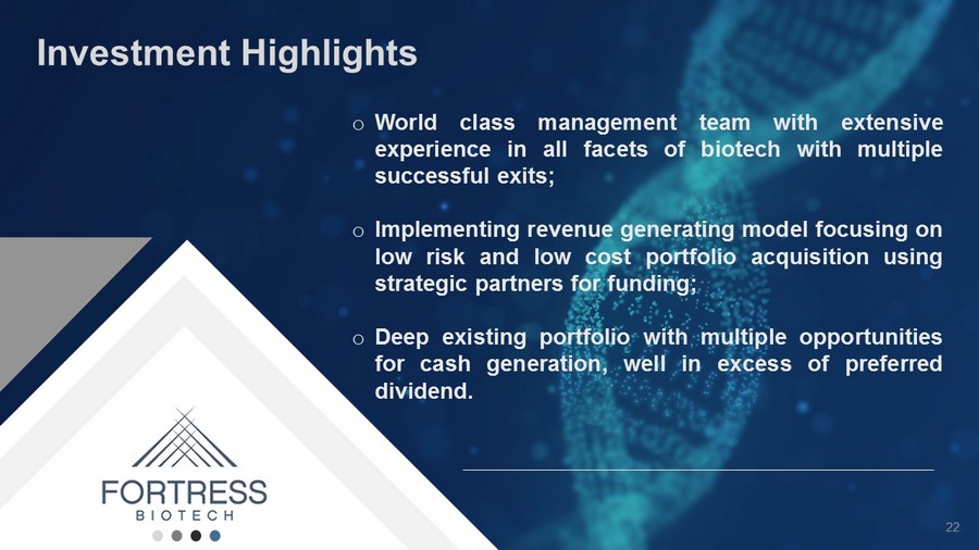 NASDAQ FBIO Shares outstanding as of 9/30/19: 70,335,534 Market Cap as of 10/31/19: ~$99.2 million Consolidated cash as of 9/30/19: $156.0 million 1 FBIO standalone cash as of 09/30/19: $55.9 million 2 Value of FBIO ownership of public partner companies as of 10/31/19: ~$77.7 million 3 1 C onsolidated cash, cash equivalents, short - term investments (certificates of deposit) and restricted cash 2 Fortress’ cash, cash equivalents, short - term investments (certificates of deposit) and restricted cash (excludes public partner companies) 3 Approximate value of Fortress’ holdings in ATXI, CKPT and MBIO 21 FORTRESS BIOTECH Financial Snapshot