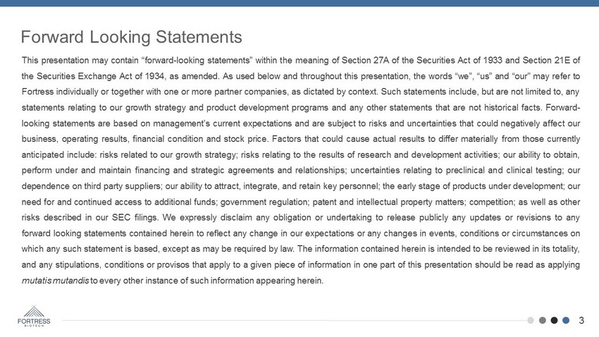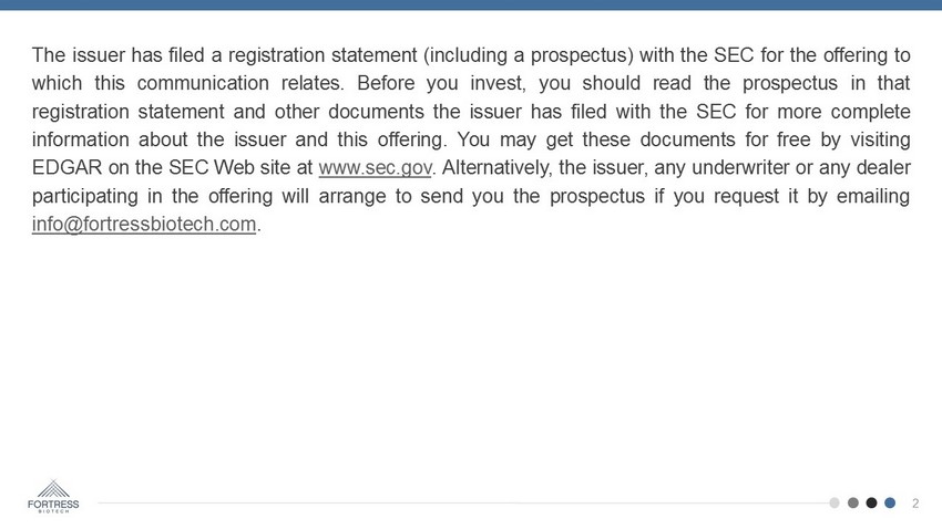 The issuer has filed a registration statement (including a prospectus) with the SEC for the offering to which this communication relates . Before you invest, you should read the prospectus in that registration statement and other documents the issuer has filed with the SEC for more complete information about the issuer and this offering . You may get these documents for free by visiting EDGAR on the SEC Web site at www . sec . gov . Alternatively, the issuer, any underwriter or any dealer participating in the offering will arrange to send you the prospectus if you request it by emailing info@fortressbiotech . com . 2