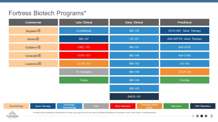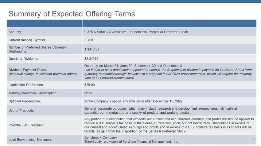 Summary of Expected Offering Terms Security: 9.375% Series A Cumulative Redeemable Perpetual Preferred Stock Current Nasdaq Symbol: FBIOP Number of Preferred Shares Currently Outstanding: 1,341,167 Quarterly Dividends: $2.34375 Dividend Payment Dates: (potential change in dividend payment dates) Quarterly on March 31, June 30, September 30 and December 31 (we intend to seek stockholder approval to change the frequency of dividends payable for Preferred Stock from quarterly to monthly through inclusion of a proposal in our 2020 proxy statement, which will require the majority vote of all Fortress stockholders) Liquidation Preference: $25.00 Maturity/Mandatory Redemption: None Optional Redemption: At the Company’s option any time on or after December 15, 2022 Use of Proceeds: General corporate purposes, which may include research and development expenditures, clinical trial expenditures, manufacture and supply of product, and working capital. Potential Tax Treatment: Any portion of a distribution that exceeds our current and accumulated earnings and profits will first be applied to reduce a U.S. holder’s tax basis in the Series A Preferred Stock, but not below zero. Distributions in excess of our current and accumulated earnings and profits and in excess of a U.S. holder’s tax basis in its shares will be taxable as gain from the disposition of the Series A Preferred Stock. Joint Bookrunning Managers: Benchmark Company ThinkEquity , a division of Fordham Financial Management, Inc. 4