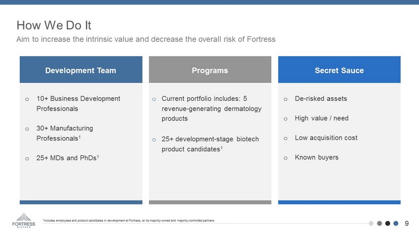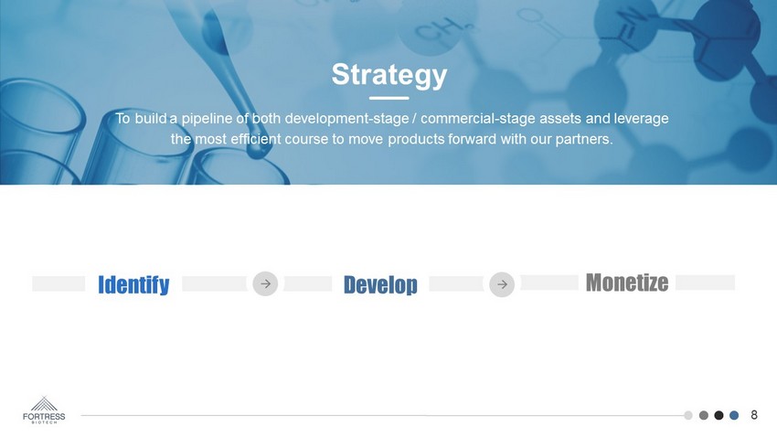 Identify Monetize Develop Strategy To build a pipeline of both development - stage / commercial - stage assets and leverage the most efficient course to move products forward with our partners. 8