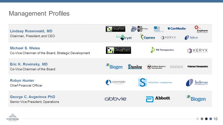 9 Development Team Programs Secret Sauce How We Do It o 10+ Business Development Professionals o 30+ Manufacturing Professionals 1 o 25+ MDs and PhDs 1 o Current portfolio includes: 5 revenue - generating dermatology products o 25+ development - stage biotech product candidates 1 o De - risked assets o High value / need o Low acquisition cost o Known buyers 1 Includes employees and product candidates in development at Fortress, at its majority - owned and majority - controlled partners. Aim to increase the intrinsic value and decrease the overall risk of Fortress