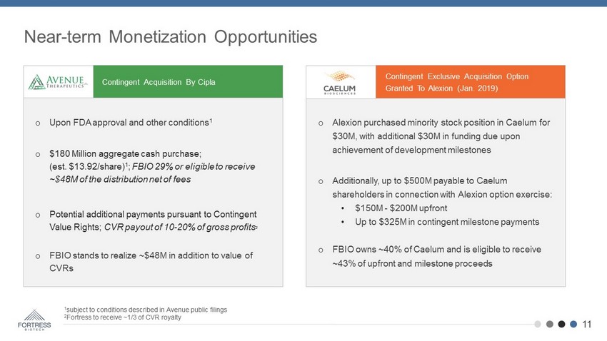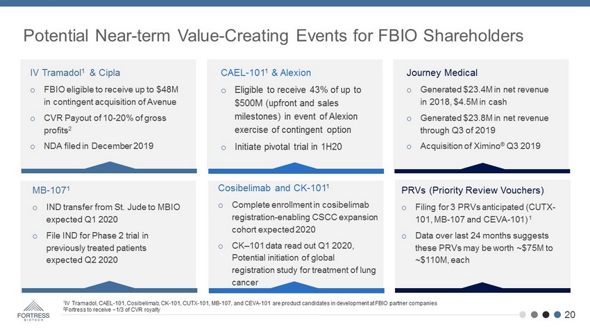 Potential Near - term Value - Creating Events for FBIO Shareholders 1 IV Tramadol, CAEL - 101, Cosibelimab, CK - 101, CUTX - 101, MB - 107, and CEVA - 101 are product candidates in development at FBIO partner companies 2 Fortress to receive ~1/3 of CVR royalty IV Tramadol 1 & Cipla o FBIO eligible to receive up to $48M in contingent acquisition of Avenue o CVR Payout of 10 - 20% of gross profits 2 o NDA f iled in December 2019 MB - 107 1 o IND transfer from St. Jude to MBIO expected Q1 2020 o File IND for Phase 2 trial in previously treated patients expected Q2 2020 Journey Medical o Generated $23.4M in net revenue in 2018, $4.5M in cash o Generated $23.8M in net revenue through Q3 of 2019 o Acquisition of Ximino ® Q3 2019 Cosibelimab and CK - 101 1 o Complete enrollment in cosibelimab registration - enabling CSCC expansion cohort expected 2020 o CK – 101 data read out Q1 2020, Potential initiation of global registration study for treatment of lung cancer 20 PRVs (Priority Review Vouchers) o Filing for 3 PRVs anticipated (CUTX - 101, MB - 107 and CEVA - 101) 1 o Data over last 24 months suggests these PRVs may be worth ~$75M to ~$110M, each CAEL - 101 1 & Alexion o Eligible to receive 43% of up to $500M (upfront and sales milestones ) in event of Alexion exercise of contingent option o Initiate pivotal trial in 1H20