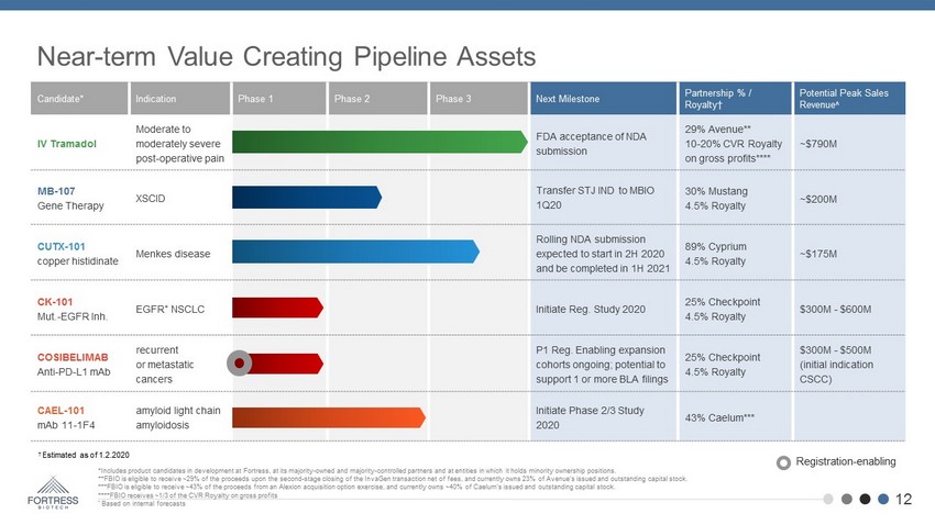 o Upon FDA approval and other conditions 1 o $180 Million aggregate cash purchase; (est. $13.92/share) 1 ; FBIO 29% or eligible to receive ~$48M of the distribution net of fees o Potential additional payments pursuant to Contingent Value Rights; CVR payout of 10 - 20% of gross profits 2 o FBIO stands to realize ~$48M in addition to value of CVRs o Alexion purchased minority stock position in Caelum for $30M, with additional $30M in funding due upon achievement of development milestones o Additionally, up to $500M payable to Caelum shareholders in connection with Alexion option exercise: • $150M - $200M upfront • Up to $325M in contingent milestone payments o FBIO owns ~40% of Caelum and is eligible to receive ~43% of upfront and milestone proceeds Near - term Monetization Opportunities 1 subject to conditions described in Avenue public filings 2 Fortress to receive ~1/3 of CVR royalty Contingent Exclusive Acquisition Option Granted To Alexion (Jan. 2019) Contingent Acquisition By Cipla 11