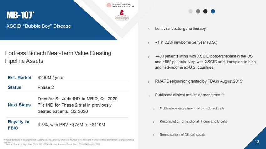 Candidate* Indication Phase 1 Phase 2 Phase 3 Next Milestone Partnership % / Royalty † Potential Peak Sales Revenue^ IV Tramadol Moderate to moderately severe post - operative pain FDA acceptance of NDA submission 29% Avenue** 10 - 20% CVR Royalty on gross profits**** ~$790M MB - 107 Gene Therapy XSCID Transfer STJ IND to MBIO 1Q20 30% Mustang 4.5% Royalty ~$200M CUTX - 101 copper histidinate Menkes disease Rolling NDA submission expected to start in 2H 2020 and be completed in 1H 2021 89% Cyprium 4.5% Royalty ~$175M CK - 101 Mut . - EGFR Inh . EGFR + NSCLC Initiate Reg. Study 2020 25% Checkpoint 4.5% Royalty $300M - $600M COSIBELIMAB Anti - PD - L1 mAb recurrent or metastatic cancers P1 Reg. Enabling expansion cohorts ongoing; potential to support 1 or more BLA filings 25% Checkpoint 4.5% Royalty $300M - $500M (initial indication CSCC) CAEL - 101 mAb 11 - 1F4 amyloid light chain amyloidosis Initiate Phase 2/3 Study 2020 43% Caelum*** Near - term Value Creating Pipeline Assets Registration - enabling † Estimated as of 1.2.2020 *Includes product candidates in development at Fortress, at its majority - owned and majority - controlled partners and at entities in which it holds minority ownership positions. **FBIO is eligible to receive ~29% of the proceeds upon the second - stage closing of the InvaGen transaction net of fees, and currently owns 23% of Avenue’s issued and outstanding capital stock. ***FBIO is eligible to receive ~43% of the proceeds from an Alexion acquisition option exercise, and currently owns ~40% of C ael um’s issued and outstanding capital stock. ****FBIO receives ~1/3 of the CVR Royalty on gross profits ^ Based on internal forecasts 12