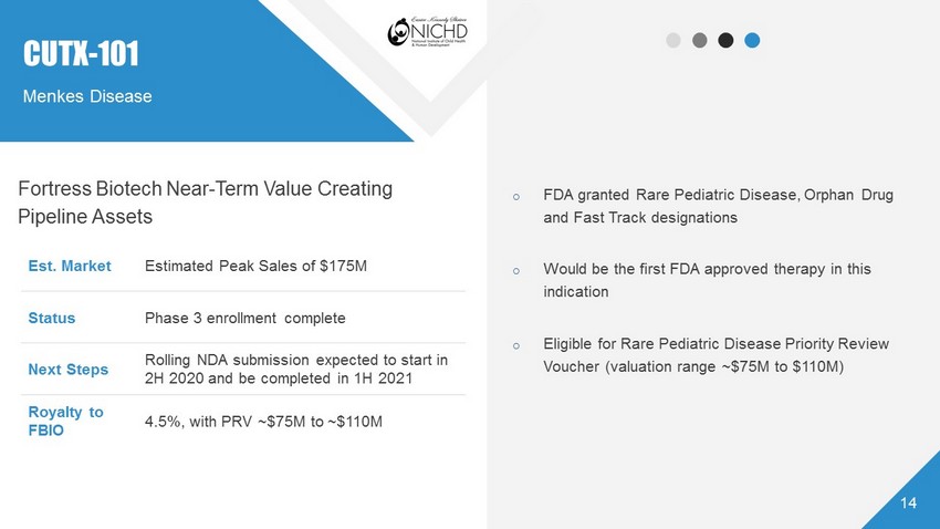 13 o Lentiviral vector gene therapy o ~1 in 225k newborns per year (U.S.) o ~400 patients living with XSCID post - transplant in the US and ~650 patients living with XSCID post - transplant in high and mid - income ex - U.S. countries o RMAT Designation granted by FDA in August 2019 o Published clinical results demonstrate**: o Multilineage engraftment of transduced cells o Reconstitution of functional T cells and B cells o Normalization of NK - cell counts MB - 107* Fortress Biotech Near - Term Value Creating Pipeline Assets XSCID “Bubble Boy” Disease Est. Market $200M / year Status Phase 2 Next Steps Transfer St. Jude IND to MBIO, Q1 2020 File IND for Phase 2 trial in previously treated patients, Q2 2020 Royalty to FBIO 4.5%, with PRV ~$75M to ~$110M *Product candidate in development at Mustang Bio, Inc., an entity which was founded by Fortress and in which Fortress still m ain tains a large ownership position. ** Mamcarz E et al. N Engl J Med. 2019; 380: 1525 - 1534; also, Mamcarz E et al. Blood. 2019;134(Suppl1): 2058.