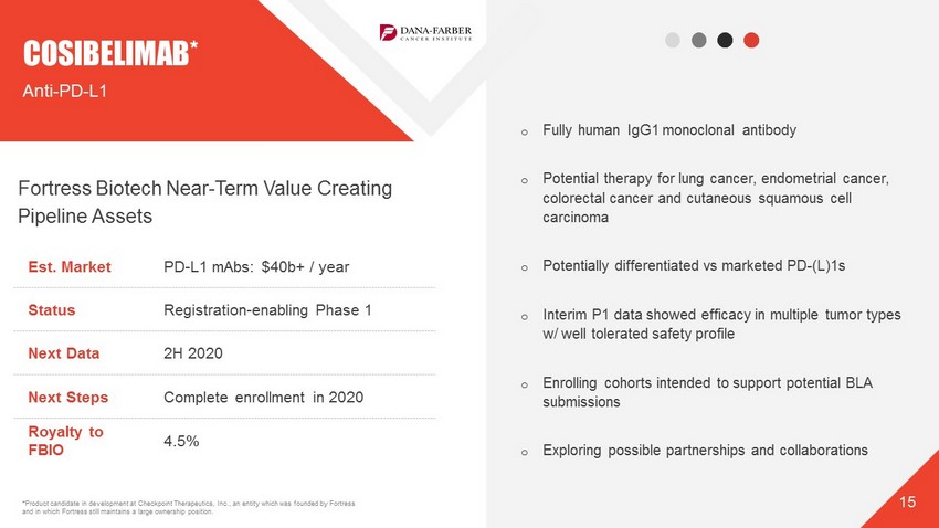 14 o FDA granted Rare Pediatric Disease, Orphan Drug and Fast Track designations o Would be the first FDA approved therapy in this indication o Eligible for Rare Pediatric Disease Priority Review Voucher (valuation range ~$75M to $110M) CUTX - 101 Fortress Biotech Near - Term Value Creating Pipeline Assets Menkes Disease Est. Market Estimated Peak Sales of $175M Status Phase 3 enrollment complete Next Steps Rolling NDA submission expected to start in 2H 2020 and be completed in 1H 2021 Royalty to FBIO 4.5%, with PRV ~$75M to ~$110M
