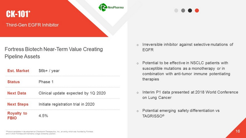 15 o Fully human IgG1 monoclonal antibody o Potential therapy for lung cancer, endometrial cancer, colorectal cancer and cutaneous squamous cell carcinoma o Potentially differentiated vs marketed PD - (L)1s o Interim P1 data showed efficacy in multiple tumor types w/ well tolerated safety profile o Enrolling cohorts intended to support potential BLA submissions o Exploring possible partnerships and collaborations COSIBELIMAB* Fortress Biotech Near - Term Value Creating Pipeline Assets Anti - PD - L1 Est. Market PD - L1 mAbs : $40b+ / year Status Registration - enabling Phase 1 Next Data 2H 2020 Next Steps Complete enrollment in 2020 Royalty to FBIO 4.5% *Product candidate in development at Checkpoint Therapeutics, Inc., an entity which was founded by Fortress and in which Fortress still maintains a large ownership position.