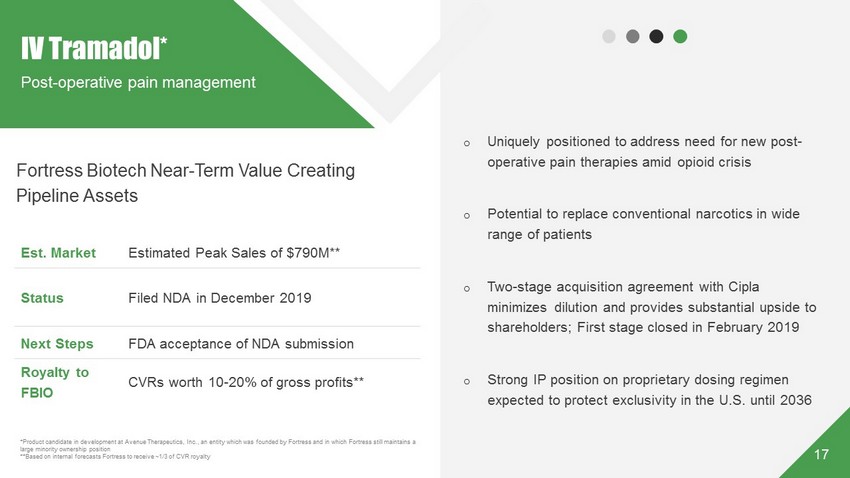16 o Irreversible inhibitor against selective mutations of EGFR o Potential to be effective in NSCLC patients with susceptible mutations as a monotherapy or in combination with anti - tumor immune potentiating therapies o Interim P1 data presented at 2018 World Conference on Lung Cancer o Potential emerging safety differentiation vs TAGRISSO ® CK - 101* Fortress Biotech Near - Term Value Creating Pipeline Assets Third - Gen EGFR Inhibitor *Product candidate in development at Checkpoint Therapeutics, Inc., an entity which was founded by Fortress and in which Fortress still maintains a large ownership position. Est. Market $6b+ / year Status Phase 1 Next Data Clinical update expected by 1Q 2020 Next Steps Initiate registration trial in 2020 Royalty to FBIO 4.5%