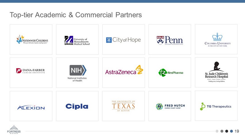 18 o Granted Orphan Drug designations in the U.S. and EU o No FDA, EMEA, or PMDA approved therapies in this indication o ~30k - 45k patients in U.S. and EU o ~4.5k newly - diagnosed patients (U.S.) per year o Potentially understated market size given AL Amyloidosis often misdiagnosed CAEL - 101* Fortress Biotech Near - Term Value Creating Pipeline Assets AL Amyloidosis *Product candidate in development at Caelum Biosciences, Inc., an entity which was founded by Fortress and in which Fortress still maintains a large minority ownership position. Est. Patient Population 30k to 45k patients in U.S. and EU Status Phase 1 Complete Next Data 2021 Next Steps Phase 2/3 study initiation 2020
