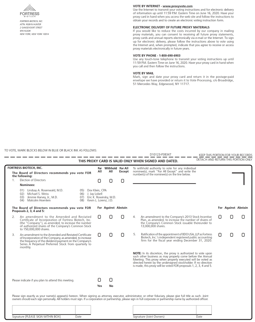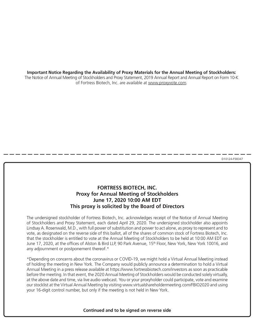 Important Notice Regarding the Availability of Proxy Materials for the Annual Meeting of Stockholders: The Notice of Annual Meeting of Stockholders and Proxy Statement, 2019 Annual Report and Annual Report on Form 10-K of Fortress Biotech, Inc. are available at www.proxyvote.com. FORTRESS BIOTECH, INC. Proxy for Annual Meeting of Stockholders June 17, 2020 10:00 AM EDT This proxy is solicited by the Board of Directors The undersigned stockholder of Fortress Biotech, Inc. acknowledges receipt of the Notice of Annual Meeting of Stockholders and Proxy Statement, each dated April 27, 2020. The undersigned stockholder also appoints Lindsay A. Rosenwald, M.D., with full power of substitution and power to act alone, as proxy to represent and to vote, as designated on the reverse side of this ballot, all of the shares of common stock of Fortress Biotech, Inc. that the stockholder is entitled to vote at the Annual Meeting of Stockholders to be held at 10:00 AM EDT on June 17, 2020, at the offices of Alston & Bird LLP, 90 Park Avenue, 15th Floor, New York, New York 10016, and any adjournment or postponement thereof.* *Depending on concerns about the coronavirus or COVID-19, we might hold a Virtual Annual Meeting instead of holding the meeting in New York. The Company would publicly announce a determination to hold a Virtual Annual Meeting in a press release available at https://www.fortressbiotech.com/investors as soon as practicable before the meeting. In that event, the 2020 Annual Meeting of Stockholders would be conducted solely virtually, at the above date and time, via live audio webcast. You or your proxyholder could participate, vote and examine our stocklist at the Virtual Annual Meeting by visiting www.virtualshareholdermeeting.com/FBIO2020 and using your 16-digit control number, but only if the meeting is not held in New York. Continued and to be signed on reverse side