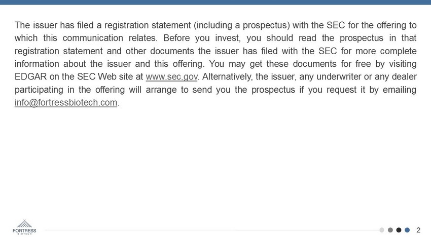 The issuer has filed a registration statement (including a prospectus) with the SEC for the offering to which this communication relates . Before you invest, you should read the prospectus in that registration statement and other documents the issuer has filed with the SEC for more complete information about the issuer and this offering . You may get these documents for free by visiting EDGAR on the SEC Web site at www . sec . gov . Alternatively, the issuer, any underwriter or any dealer participating in the offering will arrange to send you the prospectus if you request it by emailing info@fortressbiotech . com . 2
