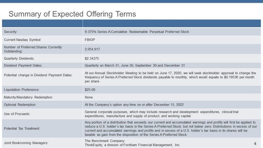 Summary of Expected Offering Terms Security: 9.375% Series A Cumulative Redeemable Perpetual Preferred Stock Current Nasdaq Symbol: FBIOP Number of Preferred Shares Currently Outstanding: 2,054,917 Quarterly Dividends: $2.34375 Dividend Payment Dates: Quarterly on March 31, June 30, September 30 and December 31 Potential change in Dividend Payment Dates: At our Annual Stockholder Meeting to be held on June 17, 2020, we will seek stockholder approval to change the frequency of Series A Preferred Stock dividends payable to monthly, which would equate to $0.19536 per month per share Liquidation Preference: $25.00 Maturity/Mandatory Redemption: None Optional Redemption: At the Company’s option any time on or after December 15, 2022 Use of Proceeds: General corporate purposes, which may include research and development expenditures, clinical trial expenditures, manufacture and supply of product, and working capital. Potential Tax Treatment: Any portion of a distribution that exceeds our current and accumulated earnings and profits will first be applied to reduce a U.S. holder’s tax basis in the Series A Preferred Stock, but not below zero. Distributions in excess of our current and accumulated earnings and profits and in excess of a U.S. holder’s tax basis in its shares will be taxable as gain from the disposition of the Series A Preferred Stock. Joint Bookrunning Managers: The Benchmark Company ThinkEquity , a division of Fordham Financial Management, Inc. 4