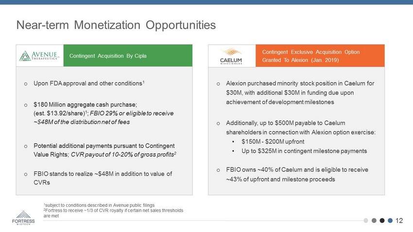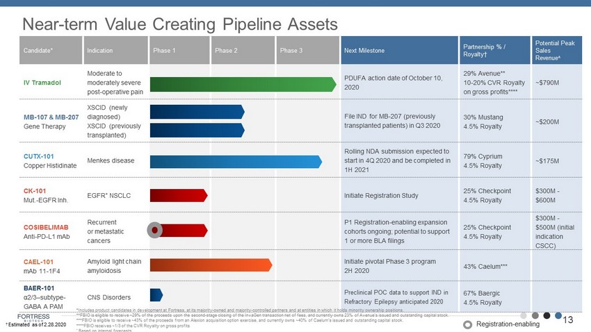 o Upon FDA approval and other conditions 1 o $180 Million aggregate cash purchase; (est. $13.92/share) 1 ; FBIO 29% or eligible to receive ~$48M of the distribution net of fees o Potential additional payments pursuant to Contingent Value Rights; CVR payout of 10 - 20% of gross profits 2 o FBIO stands to realize ~$48M in addition to value of CVRs o Alexion purchased minority stock position in Caelum for $30M, with additional $30M in funding due upon achievement of development milestones o Additionally, up to $500M payable to Caelum shareholders in connection with Alexion option exercise: • $150M - $200M upfront • Up to $325M in contingent milestone payments o FBIO owns ~40% of Caelum and is eligible to receive ~43% of upfront and milestone proceeds Near - term Monetization Opportunities 1 subject to conditions described in Avenue public filings 2 Fortress to receive ~1/3 of CVR royalty if certain net sales thresholds are met Contingent Exclusive Acquisition Option Granted To Alexion (Jan. 2019) Contingent Acquisition By Cipla 12