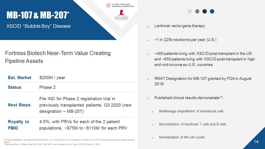 Candidate* Indication Phase 1 Phase 2 Phase 3 Next Milestone Partnership % / Royalty † Potential Peak Sales Revenue^ IV Tramadol Moderate to moderately severe post - operative pain PDUFA action date of October 10, 2020 29% Avenue** 10 - 20% CVR Royalty on gross profits**** ~$790M MB - 107 & MB - 207 Gene Therapy XSCID (newly diagnosed) XSCID (previously transplanted) File IND for MB - 207 (previously transplanted patients) in Q3 2020 30% Mustang 4.5% Royalty ~$200M CUTX - 101 Copper Histidinate Menkes disease Rolling NDA submission expected to start in 4Q 2020 and be completed in 1H 2021 79% Cyprium 4.5% Royalty ~$175M CK - 101 Mut . - EGFR Inh . EGFR + NSCLC Initiate Registration Study 25% Checkpoint 4.5% Royalty $300M - $600M COSIBELIMAB Anti - PD - L1 mAb Recurrent or metastatic cancers P1 Registration - enabling expansion cohorts ongoing; potential to support 1 or more BLA filings 25% Checkpoint 4.5% Royalty $300M - $500M (initial indication CSCC) CAEL - 101 mAb 11 - 1F4 Amyloid light chain amyloidosis Initiate pivotal Phase 3 program 2H 2020 43% Caelum*** BAER - 101 α2/3 – subtype - GABA A PAM CNS Disorders Preclinical POC data to support IND in Refractory Epilepsy anticipated 2020 67% Baergic 4.5% Royalty Near - term Value Creating Pipeline Assets Registration - enabling † Estimated as of 2.28 .2020 *Includes product candidates in development at Fortress, at its majority - owned and majority - controlled partners and at entities in which it holds minority ownership positions. **FBIO is eligible to receive ~29% of the proceeds upon the second - stage closing of the InvaGen transaction net of fees, and currently owns 23% of Avenue’s issued and outstanding capital stock. ***FBIO is eligible to receive ~43% of the proceeds from an Alexion acquisition option exercise, and currently owns ~40% of C ael um’s issued and outstanding capital stock. ****FBIO receives ~1/3 of the CVR Royalty on gross profits ^ Based on internal forecasts 13