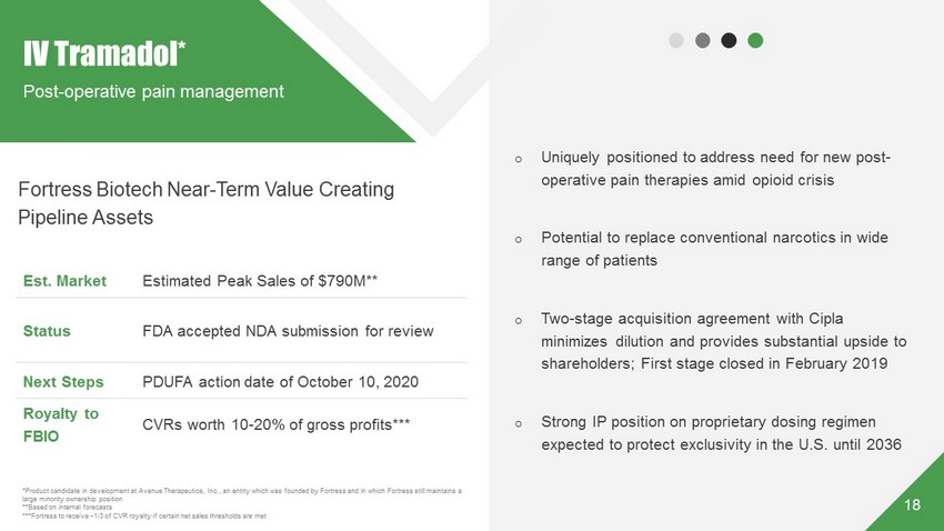 17 o Irreversible inhibitor against selective mutations of EGFR o Potential to be effective in NSCLC patients with susceptible mutations as a monotherapy or in combination with anti - tumor immune potentiating therapies o Interim P1 data presented at 2018 World Conference on Lung Cancer o Potential emerging safety differentiation vs TAGRISSO ® CK - 101* Fortress Biotech Near - Term Value Creating Pipeline Assets Third - Gen EGFR Inhibitor *Product candidate in development at Checkpoint Therapeutics, Inc., an entity which was founded by Fortress and in which Fortress still maintains a large ownership position. Est. Market $6b+ / year Status Phase 1 Next Steps Initiate registration trial Royalty to FBIO 4.5%