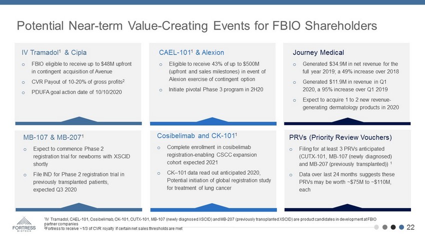 Potential Near - term Value - Creating Events for FBIO Shareholders 1 IV Tramadol, CAEL - 101, Cosibelimab, CK - 101, CUTX - 101, MB - 107 (newly diagnosed XSCID) and MB - 207 (previously transplanted XSCID) are product candidates in development at FBIO partner companies 2 Fortress to receive ~1/3 of CVR royalty if certain net sales thresholds are met IV Tramadol 1 & Cipla o FBIO eligible to receive up to $48M upfront in contingent acquisition of Avenue o CVR Payout of 10 - 20% of gross profits 2 o PDUFA goal action date of 10/10/2020 MB - 107 & MB - 207 1 o Expect to commence Phase 2 registration trial for newborns with XSCID shortly o File IND for Phase 2 registration trial in previously transplanted patients, expected Q3 2020 Journey Medical o Generated $34.9M in net revenue for the full year 2019; a 49% increase over 2018 o Generated $11.9M in revenue in Q1 2020, a 95% increase over Q1 2019 o Expect to acquire 1 to 2 new revenue - generating dermatology products in 2020 Cosibelimab and CK - 101 1 o Complete enrollment in cosibelimab registration - enabling CSCC expansion cohort expected 2021 o CK – 101 data read out anticipated 2020, Potential initiation of global registration study for treatment of lung cancer 22 PRVs (Priority Review Vouchers) o Filing for at least 3 PRVs anticipated (CUTX - 101, MB - 107 (newly diagnosed) and MB - 207 (previously transplanted)) 1 o Data over last 24 months suggests these PRVs may be worth ~$75M to ~$110M, each CAEL - 101 1 & Alexion o Eligible to receive 43% of up to $500M (upfront and sales milestones ) in event of Alexion exercise of contingent option o Initiate pivotal Phase 3 program in 2H20