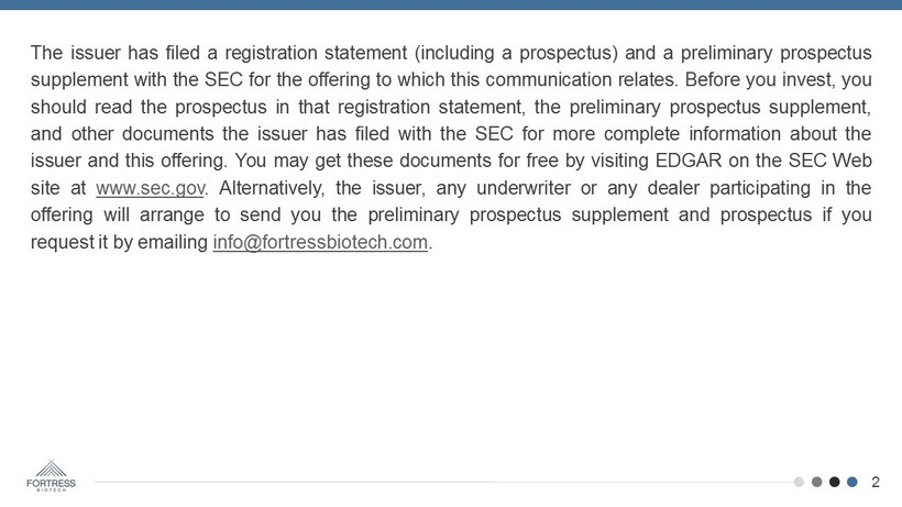 The issuer has filed a registration statement (including a prospectus) and a preliminary prospectus supplement with the SEC for the offering to which this communication relates . Before you invest, you should read the prospectus in that registration statement, the preliminary prospectus supplement, and other documents the issuer has filed with the SEC for more complete information about the issuer and this offering . You may get these documents for free by visiting EDGAR on the SEC Web site at www . sec . gov . Alternatively, the issuer, any underwriter or any dealer participating in the offering will arrange to send you the preliminary prospectus supplement and prospectus if you request it by emailing info@fortressbiotech . com . 2