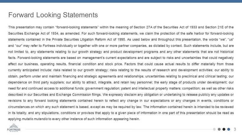 Forward Looking Statements This presentation may contain “forward - looking statements” within the meaning of Section 27 A of the Securities Act of 1933 and Section 21 E of the Securities Exchange Act of 1934 , as amended . For such forward - looking statements, we claim the protection of the safe harbor for forward - looking statements contained in the Private Securities Litigation Reform Act of 1995 . As used below and throughout this presentation, the words “we”, “us” and “our” may refer to Fortress individually or together with one or more partner companies, as dictated by context . Such statements include, but are not limited to, any statements relating to our growth strategy and product development programs and any other statements that are not historical facts . Forward - looking statements are based on management’s current expectations and are subject to risks and uncertainties that could negatively affect our business, operating results, financial condition and stock price . Factors that could cause actual results to differ materially from those currently anticipated include : risks related to our growth strategy ; risks relating to the results of research and development activities ; our ability to obtain, perform under and maintain financing and strategic agreements and relationships ; uncertainties relating to preclinical and clinical testing ; our dependence on third party suppliers ; our ability to attract, integrate, and retain key personnel ; the early stage of products under development ; our need for and continued access to additional funds ; government regulation ; patent and intellectual property matters ; competition ; as well as other risks described in our Securities and Exchange Commission filings . We expressly disclaim any obligation or undertaking to release publicly any updates or revisions to any forward looking statements contained herein to reflect any change in our expectations or any changes in events, conditions or circumstances on which any such statement is based, except as may be required by law . The information contained herein is intended to be reviewed in its totality, and any stipulations, conditions or provisos that apply to a given piece of information in one part of this presentation should be read as applying mutatis mutandis to every other instance of such information appearing herein . 3