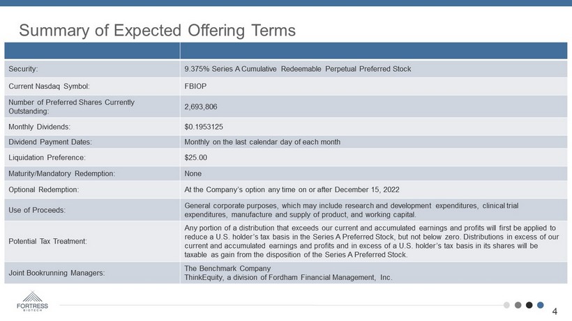 Summary of Expected Offering Terms Security: 9.375% Series A Cumulative Redeemable Perpetual Preferred Stock Current Nasdaq Symbol: FBIOP Number of Preferred Shares Currently Outstanding: 2,693,806 Monthly Dividends: $0.1953125 Dividend Payment Dates: Monthly on the last calendar day of each month Liquidation Preference: $25.00 Maturity/Mandatory Redemption: None Optional Redemption: At the Company’s option any time on or after December 15, 2022 Use of Proceeds: General corporate purposes, which may include research and development expenditures, clinical trial expenditures, manufacture and supply of product, and working capital. Potential Tax Treatment: Any portion of a distribution that exceeds our current and accumulated earnings and profits will first be applied to reduce a U.S. holder’s tax basis in the Series A Preferred Stock, but not below zero. Distributions in excess of our current and accumulated earnings and profits and in excess of a U.S. holder’s tax basis in its shares will be taxable as gain from the disposition of the Series A Preferred Stock. Joint Bookrunning Managers: The Benchmark Company ThinkEquity , a division of Fordham Financial Management, Inc. 4