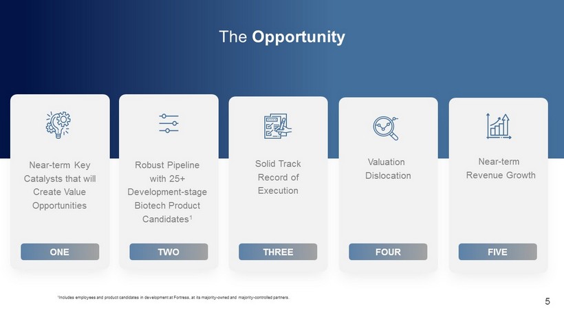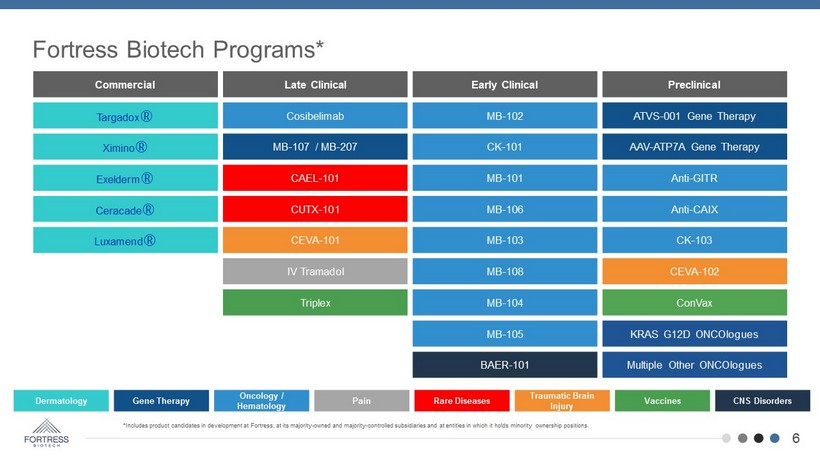 5 The Opportunity ONE TWO THREE FOUR Valuation Dislocation Near - term Key Catalysts that will Create Value Opportunities Robust Pipeline with 25+ Development - stage Biotech Product Candidates 1 Solid Track Record of Execution FIVE Near - term Revenue Growth 1 Includes employees and product candidates in development at Fortress, at its majority - owned and majority - controlled partners.