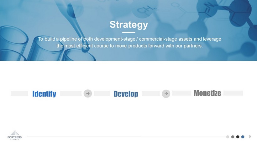 Identify Monetize Develop Strategy To build a pipeline of both development - stage / commercial - stage assets and leverage the most efficient course to move products forward with our partners. 9