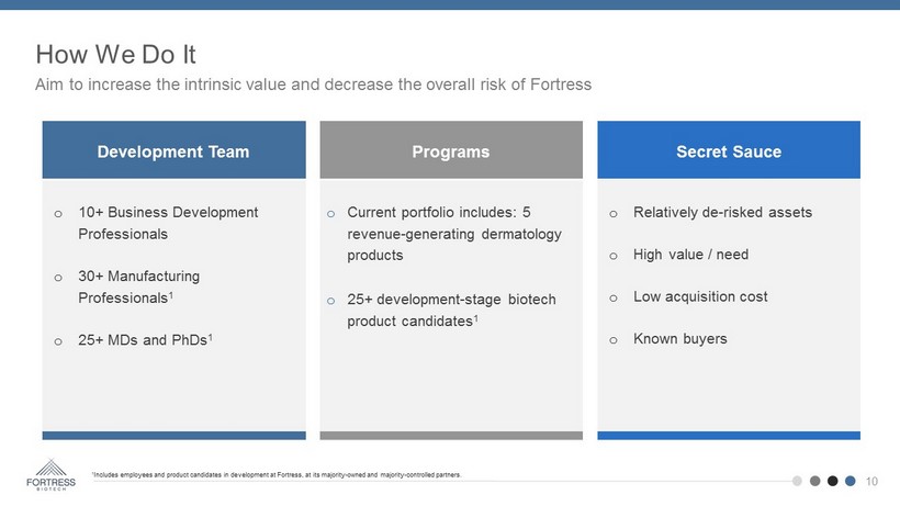 Development Team Programs Secret Sauce How We Do It o 10+ Business Development Professionals o 30+ Manufacturing Professionals 1 o 25+ MDs and PhDs 1 o Current portfolio includes: 5 revenue - generating dermatology products o 25+ development - stage biotech product candidates 1 o Relatively de - risked assets o High value / need o Low acquisition cost o Known buyers 1 Includes employees and product candidates in development at Fortress, at its majority - owned and majority - controlled partners. Aim to increase the intrinsic value and decrease the overall risk of Fortress 10