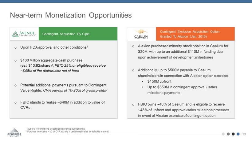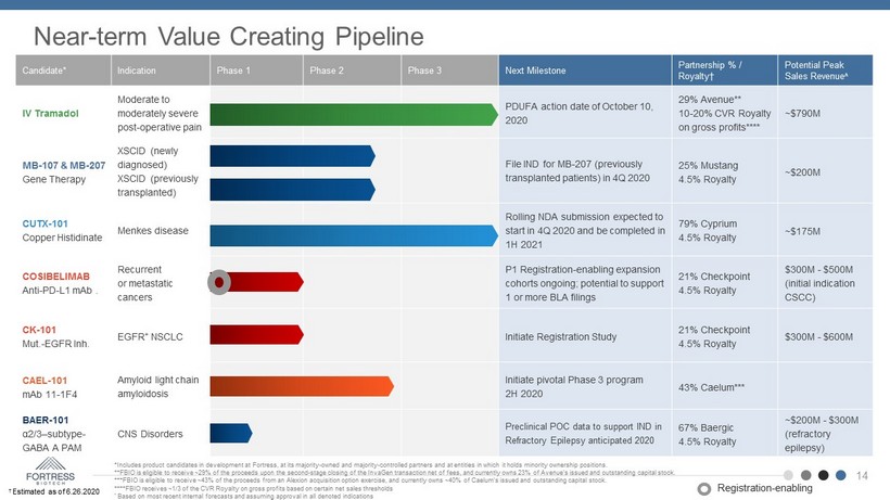 o Upon FDA approval and other conditions 1 o $180 Million aggregate cash purchase; (est. $13.92/share) 1 ; FBIO 29% or eligible to receive ~$48M of the distribution net of fees o Potential additional payments pursuant to Contingent Value Rights; CVR payout of 10 - 20% of gross profits 2 o FBIO stands to realize ~$48M in addition to value of CVRs o Alexion purchased minority stock position in Caelum for $30M, with up to an additional $110M in funding due upon achievement of development milestones o Additionally, up to $500M payable to Caelum shareholders in connection with Alexion option exercise: • $150M upfront • Up to $350M in contingent approval / sales milestone payments o FBIO owns ~40% of Caelum and is eligible to receive ~43% of upfront and approval/sales milestone proceeds in event of Alexion exercise of contingent option Near - term Monetization Opportunities 1 subject to conditions described in Avenue public filings 2 Fortress to receive ~1/3 of CVR royalty if certain net sales thresholds are met Contingent Exclusive Acquisition Option Granted To Alexion (Jan. 2019) Contingent Acquisition By Cipla 13