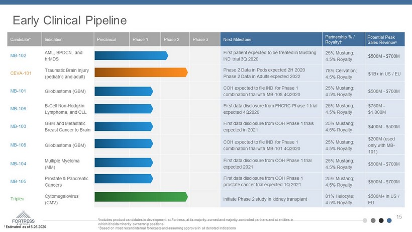 Candidate* Indication Phase 1 Phase 2 Phase 3 Next Milestone Partnership % / Royalty † Potential Peak Sales Revenue^ IV Tramadol Moderate to moderately severe post - operative pain PDUFA action date of October 10, 2020 29% Avenue** 10 - 20% CVR Royalty on gross profits**** ~$790M MB - 107 & MB - 207 Gene Therapy XSCID (newly diagnosed) XSCID (previously transplanted) File IND for MB - 207 (previously transplanted patients) in 4Q 2020 25% Mustang 4.5% Royalty ~$200M CUTX - 101 Copper Histidinate Menkes disease Rolling NDA submission expected to start in 4Q 2020 and be completed in 1H 2021 79% Cyprium 4.5% Royalty ~$175M COSIBELIMAB Anti - PD - L1 mAb . Recurrent or metastatic cancers P1 Registration - enabling expansion cohorts ongoing; potential to support 1 or more BLA filings 21% Checkpoint 4.5% Royalty $300M - $500M (initial indication CSCC) CK - 101 Mut. - EGFR Inh . EGFR + NSCLC Initiate Registration Study 21% Checkpoint 4.5% Royalty $300M - $600M CAEL - 101 mAb 11 - 1F4 Amyloid light chain amyloidosis Initiate pivotal Phase 3 program 2H 2020 43% Caelum*** BAER - 101 α2/3 – subtype - GABA A PAM CNS Disorders Preclinical POC data to support IND in Refractory Epilepsy anticipated 2020 67% Baergic 4.5% Royalty ~$200M - $300M (refractory epilepsy) Near - term Value Creating Pipeline Registration - enabling † Estimated as of 6.26.2020 *Includes product candidates in development at Fortress, at its majority - owned and majority - controlled partners and at entities in which it holds minority ownership positions. **FBIO is eligible to receive ~29% of the proceeds upon the second - stage closing of the InvaGen transaction net of fees, and currently owns 23% of Avenue’s issued and outstanding capital stock. ***FBIO is eligible to receive ~43% of the proceeds from an Alexion acquisition option exercise, and currently owns ~40% of C ael um’s issued and outstanding capital stock. ****FBIO receives ~1/3 of the CVR Royalty on gross profits based on certain net sales thresholds ^ Based on most recent internal forecasts and assuming approval in all denoted indications 14