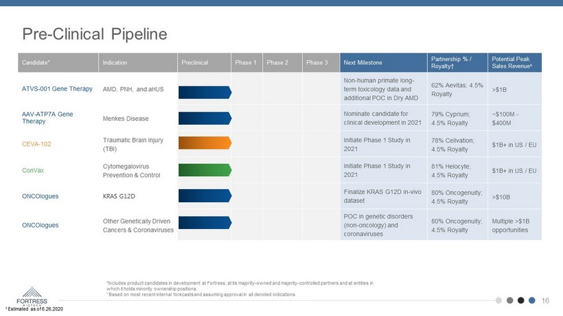 Candidate* Indication Preclinical Phase 1 Phase 2 Phase 3 Next Milestone Partnership % / Royalty † MB - 102 AML, BPDCN, and hrMDS First patient expected to be treated in Mustang IND trial 3Q 2020 25% Mustang; 4.5% Royalty $500M - $700M CEVA - 101 Traumatic Brain Injury (pediatric and adult) Phase 2 Data in Peds expected 2H 2020 Phase 2 Data in Adults expected 2022 78% Cellvation; 4.5% Royalty $1B+ in US / EU MB - 101 Glioblastoma (GBM) COH expected to file IND for Phase 1 combination trial with MB - 108 4Q2020 25% Mustang; 4.5% Royalty $500M - $700M MB - 106 B - Cell Non - Hodgkin Lymphoma, and CLL First data disclosure from FHCRC Phase 1 trial expected 4Q2020 25% Mustang; 4.5% Royalty $750M - $1,000M MB - 103 GBM and Metastatic Breast Cancer to Brain First data disclosure from COH Phase 1 trials expected in 2021 25% Mustang; 4.5% Royalty $400M - $500M MB - 108 Glioblastoma (GBM) COH expected to file IND for Phase 1 combination trial with MB - 101 4Q2020 25% Mustang; 4.5% Royalty $200M (used only with MB - 101) MB - 104 Multiple Myeloma (MM) First data disclosure from COH Phase 1 trial expected 2021 25% Mustang; 4.5% Royalty $500M - $700M MB - 105 Prostate & Pancreatic Cancers First data disclosure from COH Phase 1 prostate cancer trial expected 1Q 2021 25% Mustang; 4.5% Royalty $500M - $700M Triplex Cytomegalovirus (CMV) Initiate Phase 2 study in kidney transplant 81% Helocyte; 4.5% Royalty $500M+ in US / EU Early Clinical Pipeline 15 † Estimated as of 6.26 . 2020 *Includes product candidates in development at Fortress, at its majority - owned and majority - controlled partners and at entities in which it holds minority ownership positions. ^ Based on most recent internal forecasts and assuming approval in all denoted indications Potential Peak Sales Revenue^