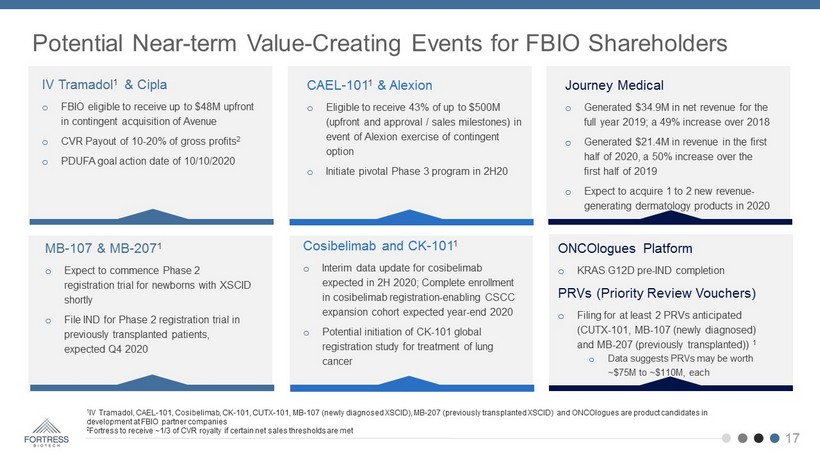 Candidate* Indication Preclinical Phase 1 Phase 2 Phase 3 Next Milestone Partnership % / Royalty † Potential Peak Sales Revenue^ ATVS - 001 Gene Therapy AMD, PNH, and aHUS Non - human primate long - term toxicology data and additional POC in Dry AMD 62% Aevitas; 4.5% Royalty >$1B AAV - ATP7A Gene Therapy Menkes Disease Nominate candidate for clinical development in 2021 79% Cyprium; 4.5% Royalty ~$100M - $400M CEVA - 102 Traumatic Brain Injury (TBI) Initiate Phase 1 Study in 2021 78% Cellvation; 4.5% Royalty $1B+ in US / EU ConVax Cytomegalovirus Prevention & Control Initiate Phase 1 Study in 2021 81% Helocyte; 4.5% Royalty $1B+ in US / EU ONCOlogues KRAS G12D Finalize KRAS G12D in - vivo dataset 80% Oncogenuity; 4.5% Royalty >$10B ONCOlogues Other Genetically Driven Cancers & Coronaviruses POC in genetic disorders (non - oncology) and coronaviruses 80% Oncogenuity; 4.5% Royalty Multiple >$1B opportunities Pre - Clinical Pipeline 16 † Estimated as of 6.26.2020 *Includes product candidates in development at Fortress, at its majority - owned and majority - controlled partners and at entities in which it holds minority ownership positions. ^ Based on most recent internal forecasts and assuming approval in all denoted indications