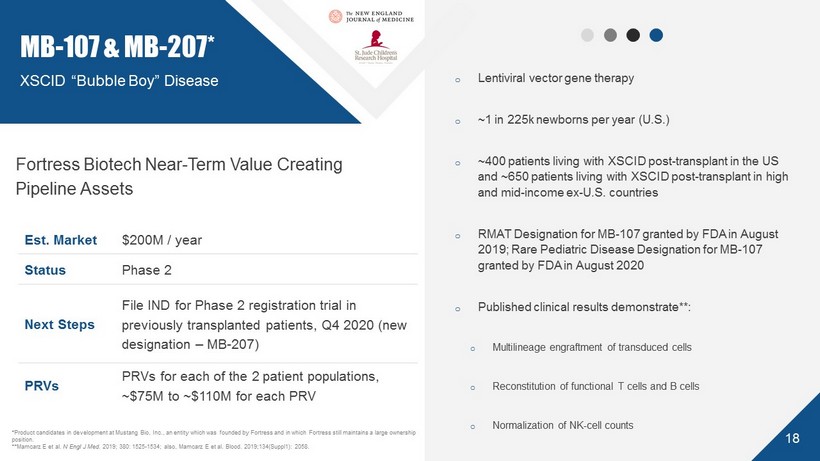 17 Potential Near - term Value - Creating Events for FBIO Shareholders 1 IV Tramadol, CAEL - 101, Cosibelimab, CK - 101, CUTX - 101, MB - 107 (newly diagnosed XSCID), MB - 207 (previously transplanted XSCID) an d ONCOlogues are product candidates in development at FBIO partner companies 2 Fortress to receive ~1/3 of CVR royalty if certain net sales thresholds are met IV Tramadol 1 & Cipla o FBIO eligible to receive up to $48M upfront in contingent acquisition of Avenue o CVR Payout of 10 - 20% of gross profits 2 o PDUFA goal action date of 10/10/2020 MB - 107 & MB - 207 1 o Expect to commence Phase 2 registration trial for newborns with XSCID shortly o File IND for Phase 2 registration trial in previously transplanted patients, expected Q4 2020 Journey Medical o Generated $34.9M in net revenue for the full year 2019; a 49% increase over 2018 o Generated $21.4M in revenue in the first half of 2020, a 50% increase over the first half of 2019 o Expect to acquire 1 to 2 new revenue - generating dermatology products in 2020 Cosibelimab and CK - 101 1 o Interim data update for cosibelimab expected in 2H 2020; Complete enrollment in cosibelimab registration - enabling CSCC expansion cohort expected year - end 2020 o Potential initiation of CK - 101 global registration study for treatment of lung cancer ONCOlogues Platform o KRAS G12D pre - IND completion PRVs (Priority Review Vouchers) o Filing for at least 2 PRVs anticipated (CUTX - 101, MB - 107 (newly diagnosed) and MB - 207 (previously transplanted)) 1 o Data suggests PRVs may be worth ~$75M to ~$110M, each CAEL - 101 1 & Alexion o Eligible to receive 43% of up to $500M (upfront and approval / sales milestones) in event of Alexion exercise of contingent option o Initiate pivotal Phase 3 program in 2H20