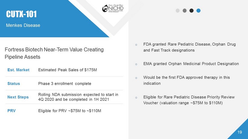 18 o Lentiviral vector gene therapy o ~1 in 225k newborns per year (U.S.) o ~400 patients living with XSCID post - transplant in the US and ~650 patients living with XSCID post - transplant in high and mid - income ex - U.S. countries o RMAT Designation for MB - 107 granted by FDA in August 2019; Rare Pediatric Disease Designation for MB - 107 granted by FDA in August 2020 o Published clinical results demonstrate**: o Multilineage engraftment of transduced cells o Reconstitution of functional T cells and B cells o Normalization of NK - cell counts MB - 107 & MB - 207* Fortress Biotech Near - Term Value Creating Pipeline Assets XSCID “Bubble Boy” Disease Est. Market $200M / year Status Phase 2 Next Steps File IND for Phase 2 registration trial in previously transplanted patients, Q4 2020 (new designation – MB - 207) PRVs PRVs for each of the 2 patient populations, ~$75M to ~$110M for each PRV *Product candidates in development at Mustang Bio, Inc., an entity which was founded by Fortress and in which Fortress still mai ntains a large ownership position. ** Mamcarz E et al. N Engl J Med. 2019; 380: 1525 - 1534; also, Mamcarz E et al. Blood. 2019;134(Suppl1): 2058.
