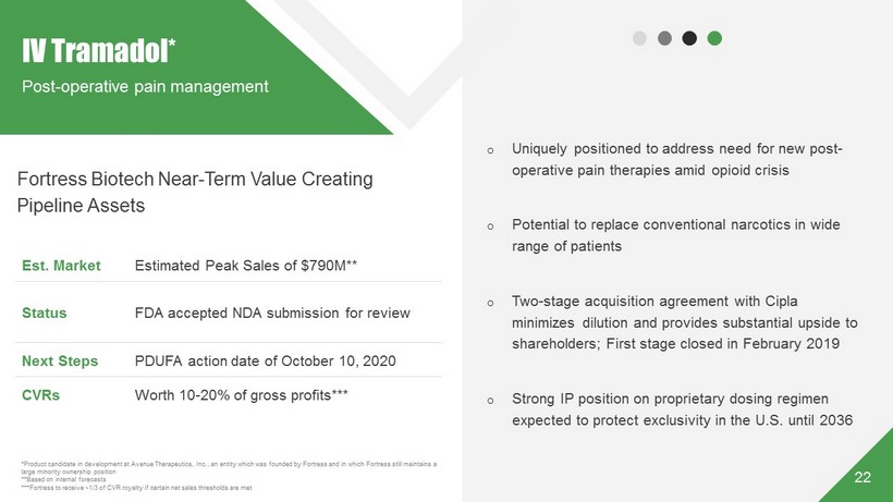 21 o Irreversible inhibitor against selective mutations of EGFR o Potential to be effective in NSCLC patients with susceptible mutations as a monotherapy or in combination with anti - tumor immune potentiating therapies o Interim P1 data presented at 2018 World Conference on Lung Cancer o Potential emerging safety differentiation vs TAGRISSO ® CK - 101* Fortress Biotech Near - Term Value Creating Pipeline Assets Third - Gen EGFR Inhibitor *Product candidate in development at Checkpoint Therapeutics, Inc., an entity which was founded by Fortress and in which Fortress still maintains a large ownership position. Est. Market $6b+ / year Status Phase 1 Next Steps Initiate registration trial