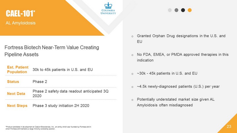 Est. Market Estimated Peak Sales of $790M** Status FDA accepted NDA submission for review Next Steps PDUFA action date of October 10, 2020 CVRs Worth 10 - 20% of gross profits*** 22 o Uniquely positioned to address need for new post - operative pain therapies amid opioid crisis o Potential to replace conventional narcotics in wide range of patients o Two - stage acquisition agreement with Cipla minimizes dilution and provides substantial upside to shareholders; First stage closed in February 2019 o Strong IP position on proprietary dosing regimen expected to protect exclusivity in the U.S. until 2036 IV Tramadol* Fortress Biotech Near - Term Value Creating Pipeline Assets Post - operative pain management *Product candidate in development at Avenue Therapeutics, Inc., an entity which was founded by Fortress and in which Fortress st ill maintains a large minority ownership position **Based on internal forecasts ***Fortress to receive ~1/3 of CVR royalty if certain net sales thresholds are met