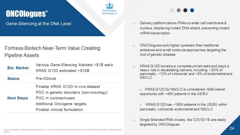 24 o Delivery platform allows PNAs to enter cell membrane & nucleus, displacing mutant DNA strand, preventing mutant mRNA transcription o ONCOlogues work higher upstream than traditional antisense and small molecule approaches, targeting the root of genetic disease o KRAS G12D remains a complete unmet need and plays a heavy role in devastating cancers, including: ~35% of pancreatic, ~12% of colorectal, and ~5% of endometrial and NSCLC o KRAS G12C for NSCLC is considered ~$4B market opportunity with ~40K patients in the US/EU o KRAS G12D has ~180K patients in the US/EU within pancreatic, colorectal, endometrial and NSCLC o Single Stranded RNA viruses, like COVID - 19, are easily targeted by ONCOlogues ONCOlogues* Fortress Biotech Near - Term Value Creating Pipeline Assets Gene - Silencing at the DNA Level Est. Market Various Gene - Silencing Markets >$1B each KRAS G12D estimated >$10B Status Pre - Clinical Next Steps Finalize KRAS G12D in - vivo dataset POC in genetic disorders (non - oncology) POC in coronaviruses Additional Oncogene targets Finalize clinical formulation *Product candidates in development at Oncogenuity, Inc., an entity which was founded by Fortress and in which Fortress still mai ntains a large ownership position.