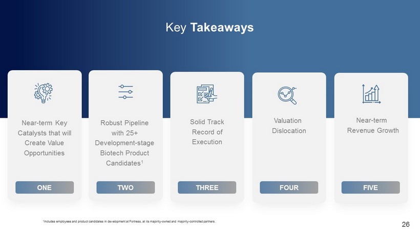 26 Key Takeaways ONE TWO THREE FOUR Valuation Dislocation Near - term Key Catalysts that will Create Value Opportunities Robust Pipeline with 25+ Development - stage Biotech Product Candidates 1 Solid Track Record of Execution FIVE Near - term Revenue Growth 1 Includes employees and product candidates in development at Fortress, at its majority - owned and majority - controlled partners.