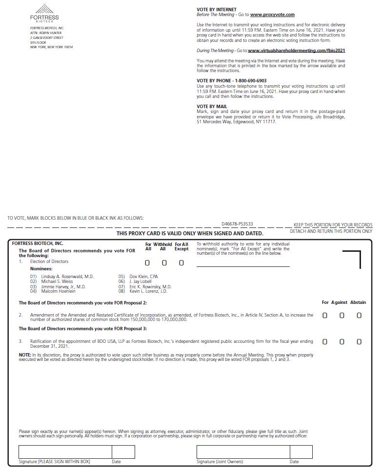 D46679-P53533 Important Notice Regarding the Availability of Proxy Materials for the Annual Meeting of Stockholders: The Notice of Annual Meeting of Stockholders and Proxy Statement, 2020 Annual Report and Annual Report on Form 10-K, as amended of Fortress Biotech, Inc. are available at www.proxyvote.com. FORTRESS BIOTECH, INC. Proxy for Annual Meeting of Stockholders June 17, 2021 10:00 AM EDT This proxy is solicited by the Board of Directors The undersigned stockholder of Fortress Biotech, Inc. acknowledges receipt of the Notice of Annual Meeting of Stockholders and Proxy Statement, each dated April 30, 2021. The undersigned stockholder also appoints Lindsay A. Rosenwald, M.D., with full power of substitution and power to act alone, as proxy to represent and to vote, as designated on the reverse side of this ballot, all of the shares of common stock of Fortress Biotech, Inc. that the stockholder is entitled to vote at the Annual Meeting of Stockholders to be held at 10:00 AM EDT on June 17, 2021, via webcast only at www.virtualshareholdermeeting.com/fbio2021, and any adjournment or postponement thereof. Continued and to be signed on reverse side