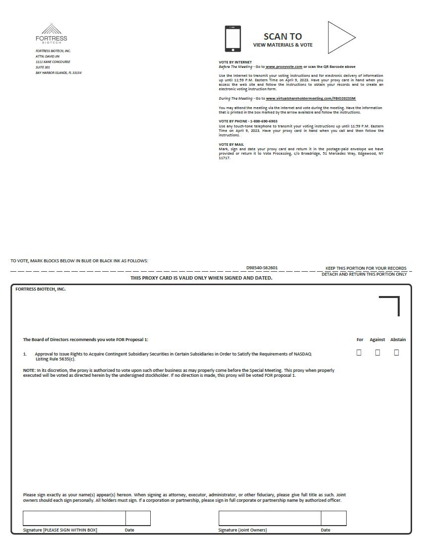 FORTRESS BIOTECH, INC. ATTN: DAVID JIN 1111 KANE CONCOURSE SUITE 301 BAY HARBOR ISLANDS, FL 33154 SCAN TO VIEW MATERIALS & VOTE VOTE BY INTERNET Before The Meeting - Go to www.proxyvote.com or scan the QR Barcode above Use the Internet to transmit your voting instructions and for electronic delivery of information up until 11:59 P.M. Eastern Time on April 9, 2023. Have your proxy card in hand when you access the web site and follow the instructions to obtain your records and to create an electronic voting instruction form. During The Meeting - Go to www.virtualshareholdermeeting.com/FBIO2023SM You may attend the meeting via the Internet and vote during the meeting. Have the information that is printed in the box marked by the arrow available and follow the instructions. VOTE BY PHONE - 1-800-690-6903 Use any touch-tone telephone to transmit your voting instructions up until 11:59 P.M. Eastern Time on April 9, 2023. Have your proxy card in hand when you call and then follow the instructions. VOTE BY MAIL Mark, sign and date your proxy card and return it in the postage-paid envelope we have provided or return it to Vote Processing, c/o Broadridge, 51 Mercedes Way, Edgewood, NY 11717. TO VOTE, MARK BLOCKS BELOW IN BLUE OR BLACK INK AS FOLLOWS: D98540-S62601 KEEP THIS PORTION FOR YOUR RECORDS THIS PROXY CARD IS VALID ONLY WHEN SIGNED AND DATED. DETACH AND RETURN THIS PORTION ONLY FORTRESS BIOTECH, INC. The Board of Directors recommends you vote FOR Proposal 1: For Against Abstain 1. Approval to Issue Rights to Acquire Contingent Subsidiary Securities in Certain Subsidiaries in Order to Satisfy the Requirements of NASDAQ Listing Rule 5635(c). NOTE: In its discretion, the proxy is authorized to vote upon such other business as may properly come before the Special Meeting. This proxy when properly executed will be voted as directed herein by the undersigned stockholder. If no direction is made, this proxy will be voted FOR proposal 1. Please sign exactly as your name(s) appear(s) hereon. When signing as attorney, executor, administrator, or other fiduciary, please give full title as such. Joint owners should each sign personally. All holders must sign. If a corporation or partnership, please sign in full corporate or partnership name by authorized officer. Signature [PLEASE SIGN WITHIN BOX] Date Signature (Joint Owners) Date