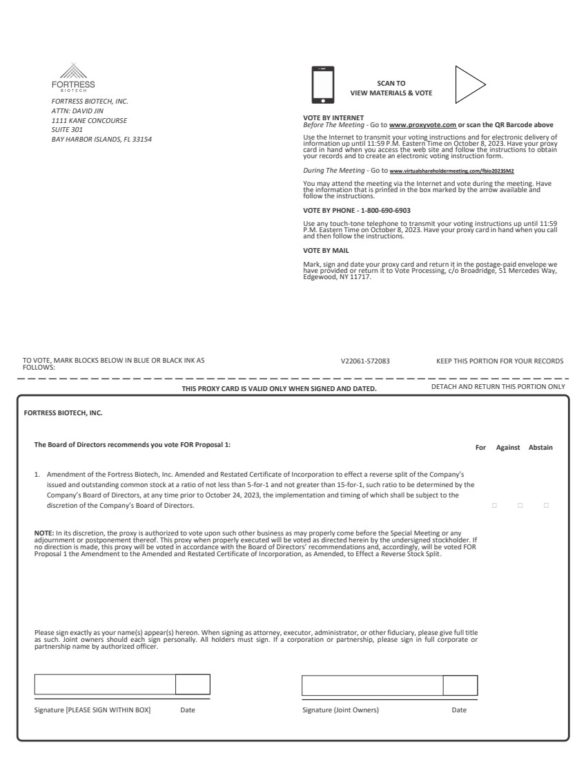 ![]() | SCAN TO VIEW MATERIALS & VOTE FORTRESS BIOTECH, INC. ATTN: DAVID JIN 1111 KANE CONCOURSE SUITE 301 BAY HARBOR ISLANDS, FL 33154 VOTE BY INTERNET Before The Meeting - Go to www.proxyvote.com or scan the QR Barcode above Use the Internet to transmit your voting instructions and for electronic delivery of information up until 11:59 P.M. Eastern Time on October 8, 2023. Have your proxy card in hand when you access the web site and follow the instructions to obtain your records and to create an electronic voting instruction form. During The Meeting - Go to www.virtualshareholdermeeting.com/fbio2023SM2 You may attend the meeting via the Internet and vote during the meeting. Have the information that is printed in the box marked by the arrow available and follow the instructions. VOTE BY PHONE - 1-800-690-6903 Use any touch-tone telephone to transmit your voting instructions up until 11:59 P.M. Eastern Time on October 8, 2023. Have your proxy card in hand when you call and then follow the instructions. VOTE BY MAIL Mark, sign and date your proxy card and return it in the postage-paid envelope we have provided or return it to Vote Processing, c/o Broadridge, 51 Mercedes Way, Edgewood, NY 11717. TO VOTE, MARK BLOCKS BELOW IN BLUE OR BLACK INK AS FOLLOWS: V22061-S72083 KEEP THIS PORTION FOR YOUR RECORDS THIS PROXY CARD IS VALID ONLY WHEN SIGNED AND DATED. DETACH AND RETURN THIS PORTION ONLY FORTRESS BIOTECH, INC. The Board of Directors recommends you vote FOR Proposal 1: For Against Abstain 1. Amendment of the Fortress Biotech, Inc. Amended and Restated Certificate of Incorporation to effect a reverse split of the Company’s issued and outstanding common stock at a ratio of not less than 5-for-1 and not greater than 15-for-1, such ratio to be determined by the Company’s Board of Directors, at any time prior to October 24, 2023, the implementation and timing of which shall be subject to the discretion of the Company’s Board of Directors. NOTE: In its discretion, the proxy is authorized to vote upon such other business as may properly come before the Special Meeting or any adjournment or postponement thereof. This proxy when properly executed will be voted as directed herein by the undersigned stockholder. If no direction is made, this proxy will be voted in accordance with the Board of Directors’ recommendations and, accordingly, will be voted FOR Proposal 1 the Amendment to the Amended and Restated Certificate of Incorporation, as Amended, to Effect a Reverse Stock Split. Please sign exactly as your name(s) appear(s) hereon. When signing as attorney, executor, administrator, or other fiduciary, please give full title as such. Joint owners should each sign personally. All holders must sign. If a corporation or partnership, please sign in full corporate or partnership name by authorized officer. Signature [PLEASE SIGN WITHIN BOX] Date Signature (Joint Owners) Date |