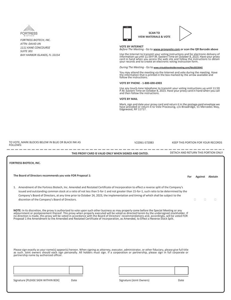 ![]() | SCAN TO VIEW MATERIALS & VOTE FORTRESS BIOTECH, INC. ATTN: DAVID JIN 1111 KANE CONCOURSE SUITE 301 BAY HARBOR ISLANDS, FL 33154 VOTE BY INTERNET Before The Meeting - Go to www.proxyvote.com or scan the QR Barcode above Use the Internet to transmit your voting instructions and for electronic delivery of information up until 11:59 P.M. Eastern Time on October 8, 2023. Have your proxy card in hand when you access the web site and follow the instructions to obtain your records and to create an electronic voting instruction form. During The Meeting - Go to www.virtualshareholdermeeting.com/fbio2023SM2 You may attend the meeting via the Internet and vote during the meeting. Have the information that is printed in the box marked by the arrow available and follow the instructions. VOTE BY PHONE - 1-800-690-6903 Use any touch-tone telephone to transmit your voting instructions up until 11:59 P.M. Eastern Time on October 8, 2023. Have your proxy card in hand when you call and then follow the instructions. VOTE BY MAIL Mark, sign and date your proxy card and return it in the postage-paid envelope we have provided or return it to Vote Processing, c/o Broadridge, 51 Mercedes Way, Edgewood, NY 11717. TO VOTE, MARK BLOCKS BELOW IN BLUE OR BLACK INK AS FOLLOWS: V22061-S72083 KEEP THIS PORTION FOR YOUR RECORDS THIS PROXY CARD IS VALID ONLY WHEN SIGNED AND DATED. DETACH AND RETURN THIS PORTION ONLY FORTRESS BIOTECH, INC. The Board of Directors recommends you vote FOR Proposal 1: For Against Abstain 1. Amendment of the Fortress Biotech, Inc. Amended and Restated Certificate of Incorporation to effect a reverse split of the Company’s issued and outstanding common stock at a ratio of not less than 5-for-1 and not greater than 15-for-1, such ratio to be determined by the Company’s Board of Directors, at any time prior to October 24, 2023, the implementation and timing of which shall be subject to the discretion of the Company’s Board of Directors. NOTE: In its discretion, the proxy is authorized to vote upon such other business as may properly come before the Special Meeting or any adjournment or postponement thereof. This proxy when properly executed will be voted as directed herein by the undersigned stockholder. If no direction is made, this proxy will be voted in accordance with the Board of Directors’ recommendations and, accordingly, will be voted FOR Proposal 1 the Amendment to the Amended and Restated Certificate of Incorporation, as Amended, to Effect a Reverse Stock Split. Please sign exactly as your name(s) appear(s) hereon. When signing as attorney, executor, administrator, or other fiduciary, please give full title as such. Joint owners should each sign personally. All holders must sign. If a corporation or partnership, please sign in full corporate or partnership name by authorized officer. Signature [PLEASE SIGN WITHIN BOX] Date Signature (Joint Owners) Date |