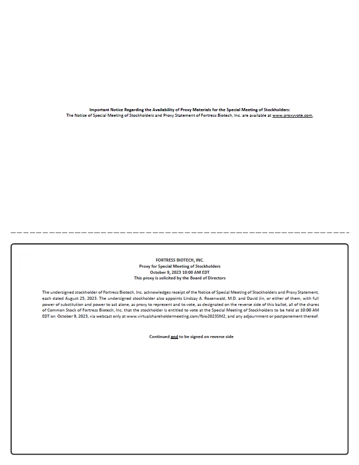 | Important Notice Regarding the Availability of Proxy Materials for the Special Meeting of Stockholders: The Notice of Special Meeting of Stockholders and Proxy Statement of Fortress Biotech, Inc. are available at www.proxyvote.com. FORTRESS BIOTECH, INC. Proxy for Special Meeting of Stockholders October 9, 2023 10:00 AM EDT This proxy is solicited by the Board of Directors The undersigned stockholder of Fortress Biotech, Inc. acknowledges receipt of the Notice of Special Meeting of Stockholders and Proxy Statement, each dated [•], 2023. The undersigned stockholder also appoints Lindsay A. Rosenwald, M.D. and David Jin, or either of them, with full power of substitution and power to act alone, as proxy to represent and to vote, as designated on the reverse side of this ballot, all of the shares of Common Stock of Fortress Biotech, Inc. that the stockholder is entitled to vote at the Special Meeting of Stockholders to be held at 10:00 AM EDT on October 9, 2023, via webcast only at www.virtualshareholdermeeting.com/fbio2023SM2, and any adjournment or postponement thereof. Continued and to be signed on reverse side |