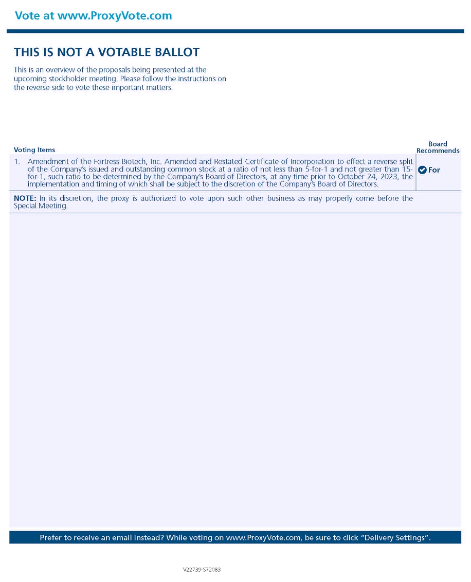 Your Vote Counts! FORTRESS BIOTECH, INC. ATTN: DAVID JIN 1111 KANE CONCOURSE SUITE 301 BAY HARBOR ISLANDS, FL 33154 FORTRESS BIOTECH, INC. 2023 Special Meeting Vote by October 8, 2023 11:59 PM ET Vote Virtually at the Meeting* October 9, 2023 10:00 AM EDT Virtually at: www.virtualshareholdermeeting.com/fbio2023SM2 *Please check the meeting materials for any special requirements for meeting attendance. Smartphone users Point your camera here and vote without entering a control number For complete information and to vote, visit www.ProxyVote.com Control # V22066-S72083 Get informed before you vote View the Notice of Special Meeting of Stockholders and Proxy Statement of Fortress Biotech, Inc. online OR you can receive a free paper or email copy of the material(s) by requesting prior to September 25, 2023. If you would like to request a copy of the material(s) for this and/or future stockholder meetings, you may (1) visit www.ProxyVote.com, (2) call 1-800-579-1639 or (3) send an email to sendmaterial@proxyvote.com. If sending an email, please include your control number (indicated below) in the subject line. Unless requested, you will not otherwise receive a paper or email copy. You invested in FORTRESS BIOTECH, INC. and it's time to vote! You have the right to vote on proposals being presented at the Special Meeting. This is an important notice regarding the availability of proxy material for the stockholder meeting to be held virtually on October 9, 2023 at 10:00 a.m., Eastern Time.