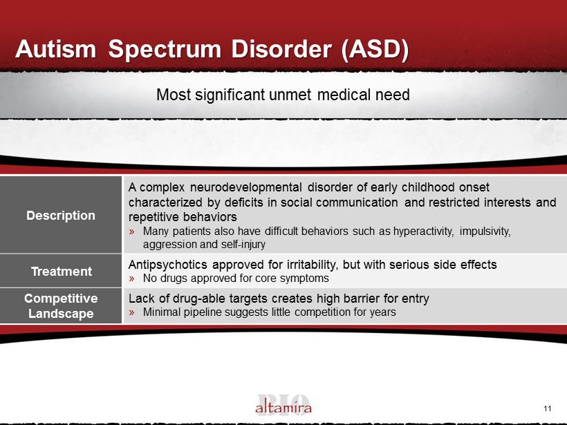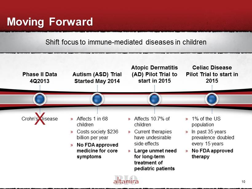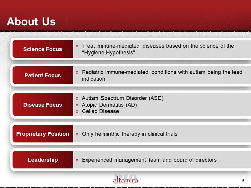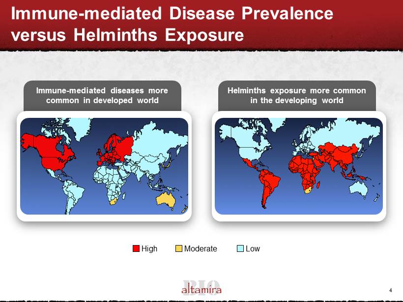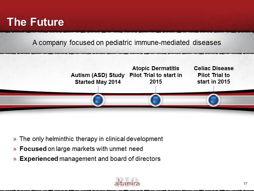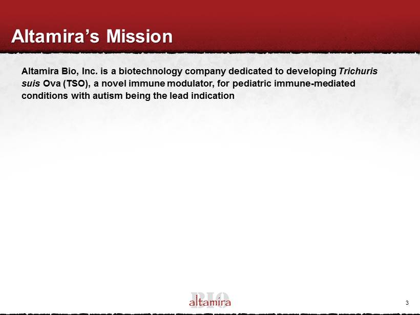 Altamira’s Mission Altamira Bio, Inc. is a biotechnology company dedicated to developing Trichuris suis Ova (TSO), a novel immune modulator, for pediatric immune - mediated conditions with autism being the lead indication 3