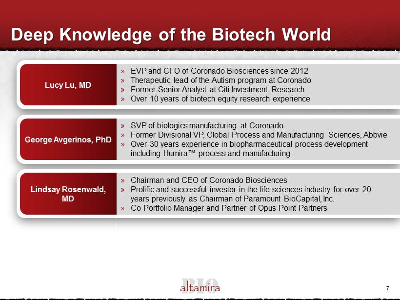About Us 6 Science Focus » Treat immune - mediated diseases based on the science of the “Hygiene Hypothesis” Patient Focus » Pediatric immune - mediated conditions with autism being the lead indication Disease Focus » Autism Spectrum Disorder (ASD) » Atopic Dermatitis (AD) » Celiac Disease Proprietary Position » Only helminthic therapy in clinical trials Leadership » Experienced management team and board of directors